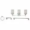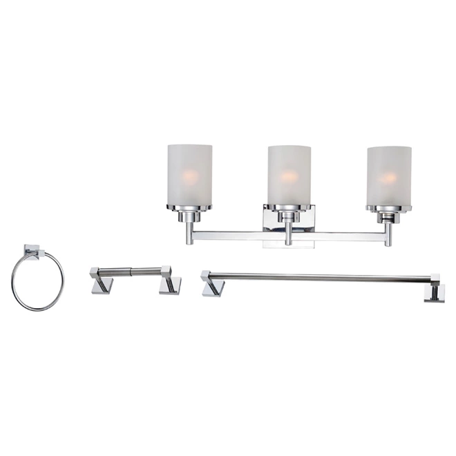 This Uberhaus vanity light and bathroom accessory set has everything you need to finish off your bathroom space. The vanity light features three white glass shades that softly diffuse light for great illumination. The chrome-finished frame ties together the look of the included 22″ towel bar, the towel ring and the toilet paper holder to bring harmonized, modern style to your bathroom. The wall-mounted light fixture requires three 60-watt Type A E26 light bulbs (not included).