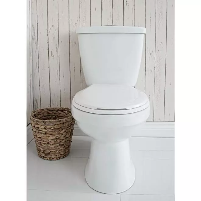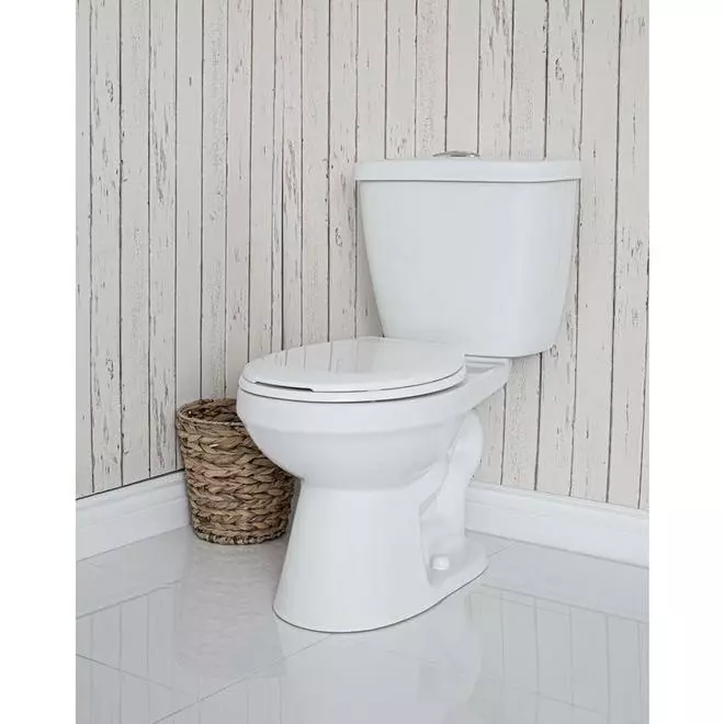 This high-efficiency 2-piece toilet by Project Source features a standard height and round front bowl. It has a chrome top push button, a lined tank, and a plastic seat. It features a 1000 g flush capacity and a dual flush system that helps reduce water consumption. Big and small flushes use respectively 6 litres and 4 litres of water. Everything you need for installation is included in the box. This grade A porcelain toilet is WaterSense labelled and comes with a 5-year limited warranty.
