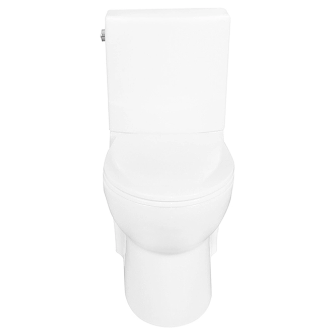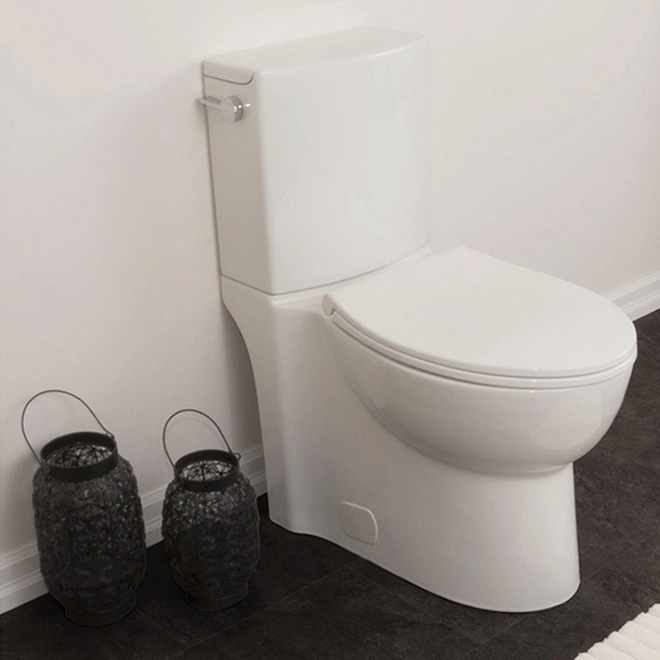 This 2-piece Gillian toilet by Project Source has a rimless elongated bowl and a slow-close lid that prevents slamming. This comfort height toilet has an 800-gram flush capacity, and its concealed trapway makes cleaning easier. Wax ring, floor bolts, and slow close seat are included with purchase. This modern toilet only uses 4.8 litres per flush and is therefore perfect for people who want to reduce their water footprint. This model comes with a 5-year limited warranty.