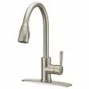 This Project Source kitchen faucet is made of lead-free brass and has a beautiful brushed nickel finish that will enhance the look of your kitchen. It’s equipped with a lever handle and a pull-down spout with dual spray and stream functions that makes it easy to rinse the sink. It has a ceramic cartridge and comes with an optional deck plate. Backed by a limited lifetime warranty.