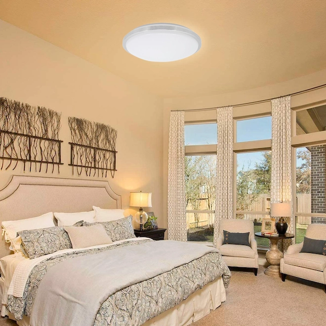 Set of 2 circular flush mount ceiling lights from Project Source with a brushed nickel finish. The 12-in light fixtures have integrated LED lighting that lasts 30,000 hours and come with a 5-year warranty.